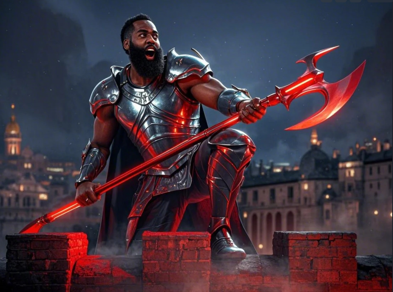 - 【AI繪圖】50分!登哥身穿紅芒鎧甲手拿鉤戟站在城墻上怒吼