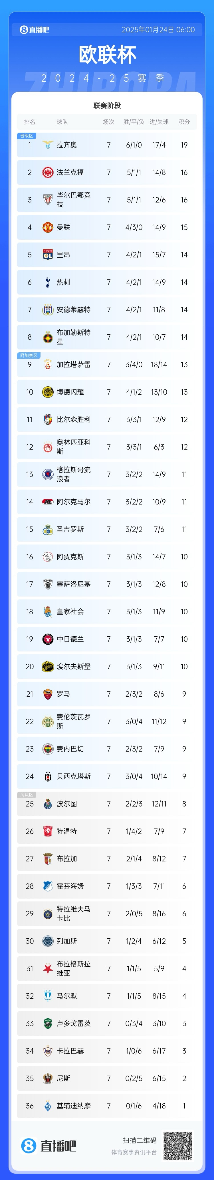 01月24日訊 歐聯(lián)杯結束第七輪比賽,官網(wǎng)更新積分形勢,只有拉齊奧確定提前晉級,曼聯(lián)、熱刺等14隊至少附加賽資格,已有7隊確定被淘汰。