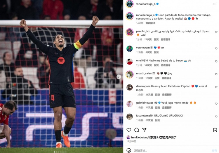 隊(duì)長(zhǎng)阿勞霍也在個(gè)人社媒曬出仰天長(zhǎng)嘯慶祝照,配文寫道:“全隊(duì)?wèi){借努力、決心以及意志踢出一場(chǎng)精彩的比賽,讓我們下一回合再來(lái)!”