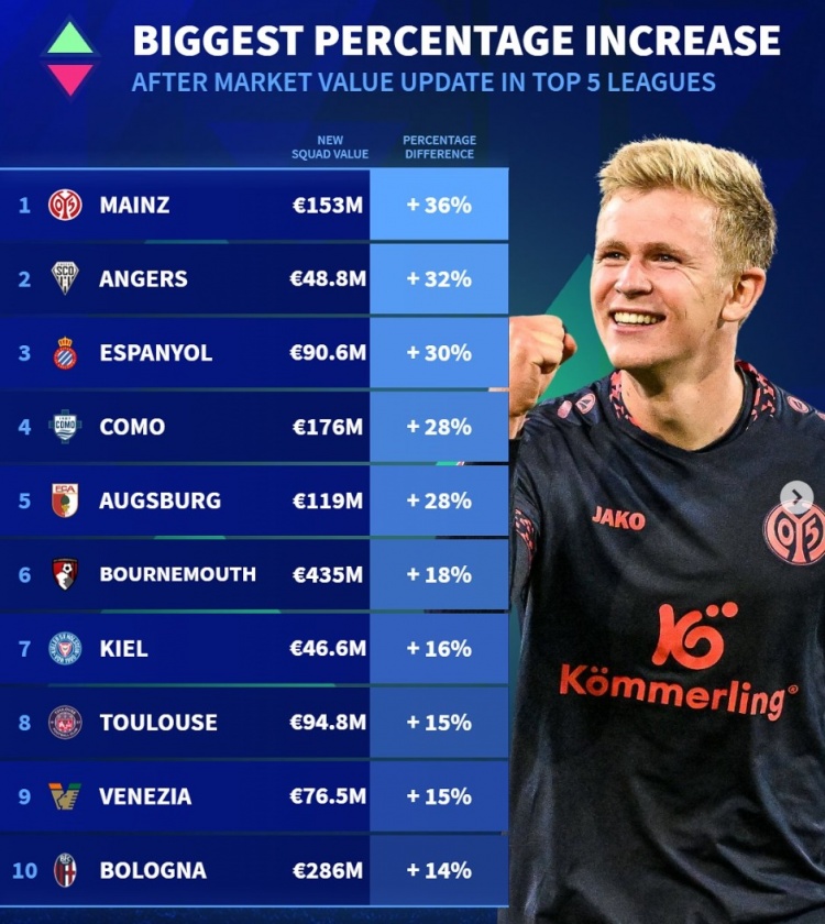 五大聯(lián)賽球隊(duì)身價(jià)升值比例:美因茨漲36%,博洛尼亞&伯恩茅斯在列