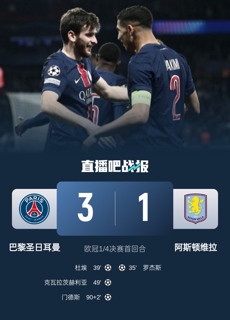歐冠8強首回合,巴黎3-1擊敗維拉,杜埃破門,克瓦拉茨赫利亞精彩一條龍,門德斯補時再入一球。